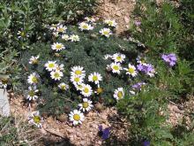 Mat daisy is a low growing spring blooming plant. Drought tolerant. Not exactly a groundcover, as the top growth disappears during summer and reemerges as a green basal rosette in fall, getting ready to bloom again in the spring. Blooms late March to May with small white daisy-like flowers that have pink undersides. Forms a compact ground-hugging mat. Will self seed some, but never invasively.