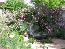 Remarkable old Bourbon rose dating to 1868. Remarkable for fragrance and bright cerise pink flowers, and best of all, thornless canes -- it's people friendly! Not strictly a climber, but a mannerly climber.